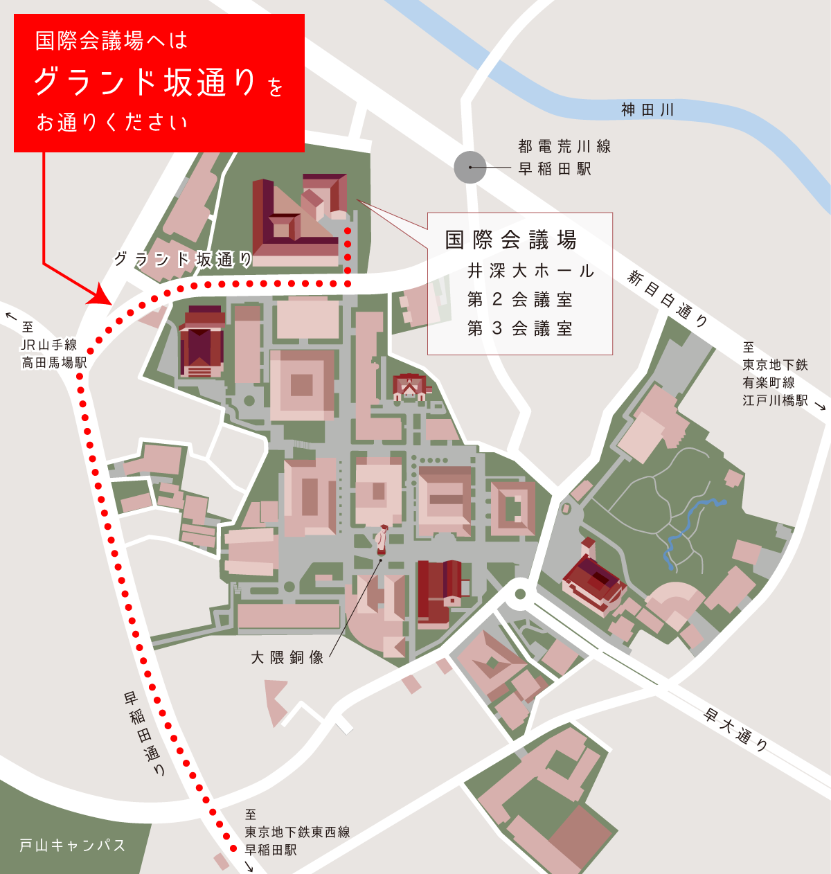 Googleマップで「早稲田駅」から「国際会議場」を検索すると、早稲田キャンパス内を通過する最短ルート(徒歩約10分)が表示される場合がありますが、当日はキャンパス内を通行せず、早稲田通りからグランド坂通りを下るルート(徒歩約11分)をご利用のうえ、ご来場くださいますようお願いいたします。